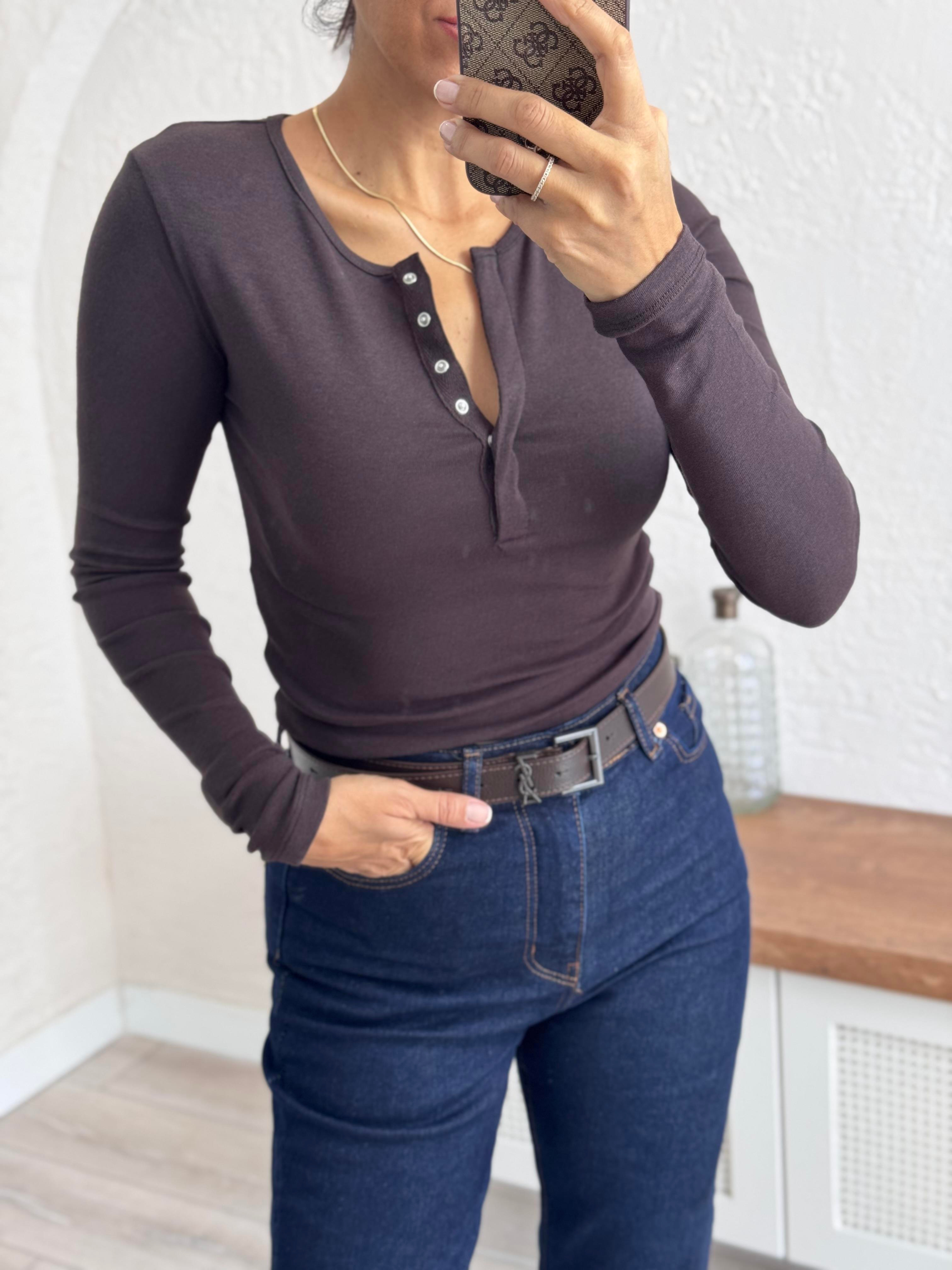 Uzun Kollu Çıtçıt Düğmeli Badi Kahve