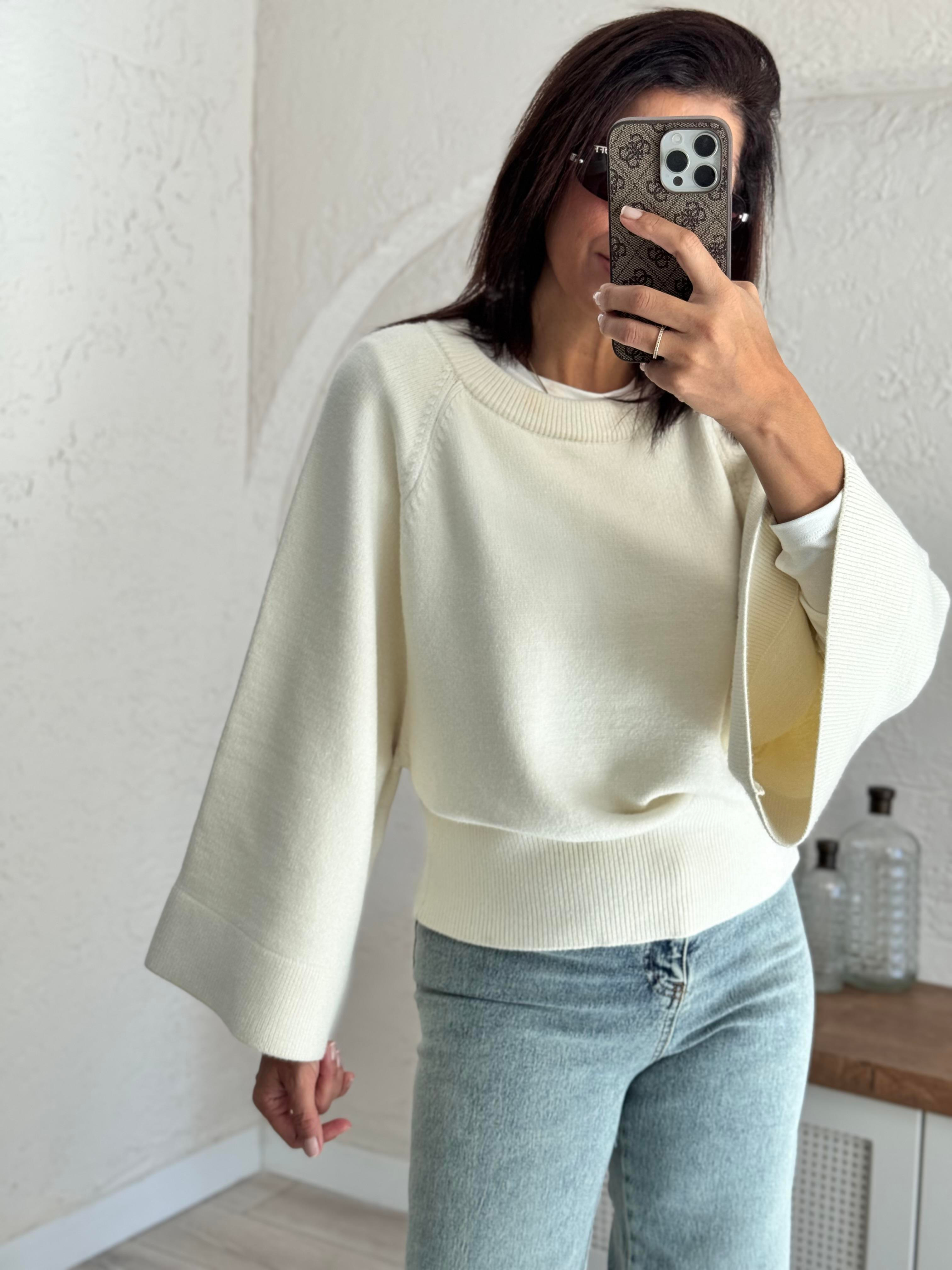 Bisiklet Yaka Geniş Kol Triko Kazak Ekru