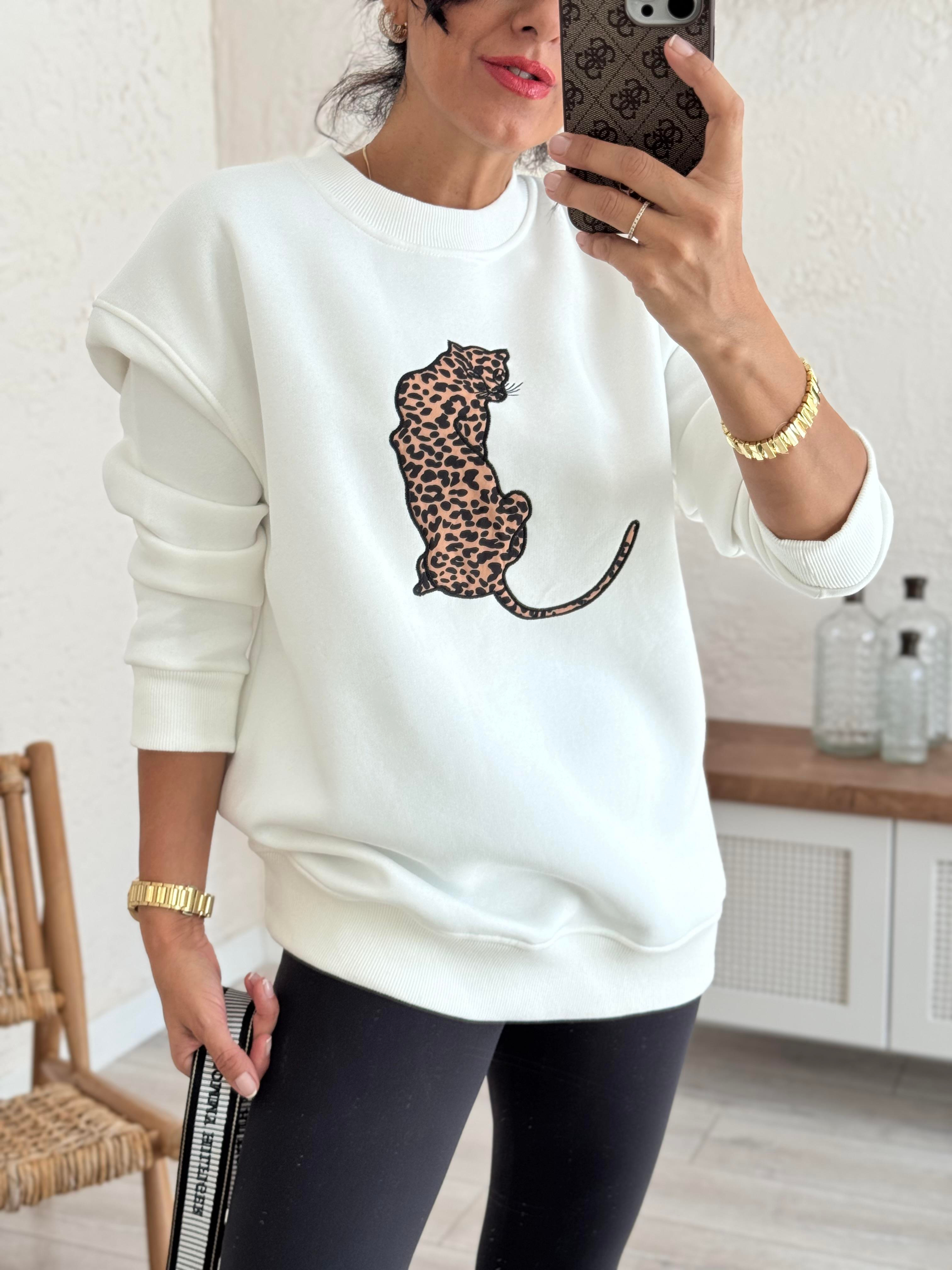 Bisiklet Yaka Leopar Figürlü Sweat Beyaz (8377-1)