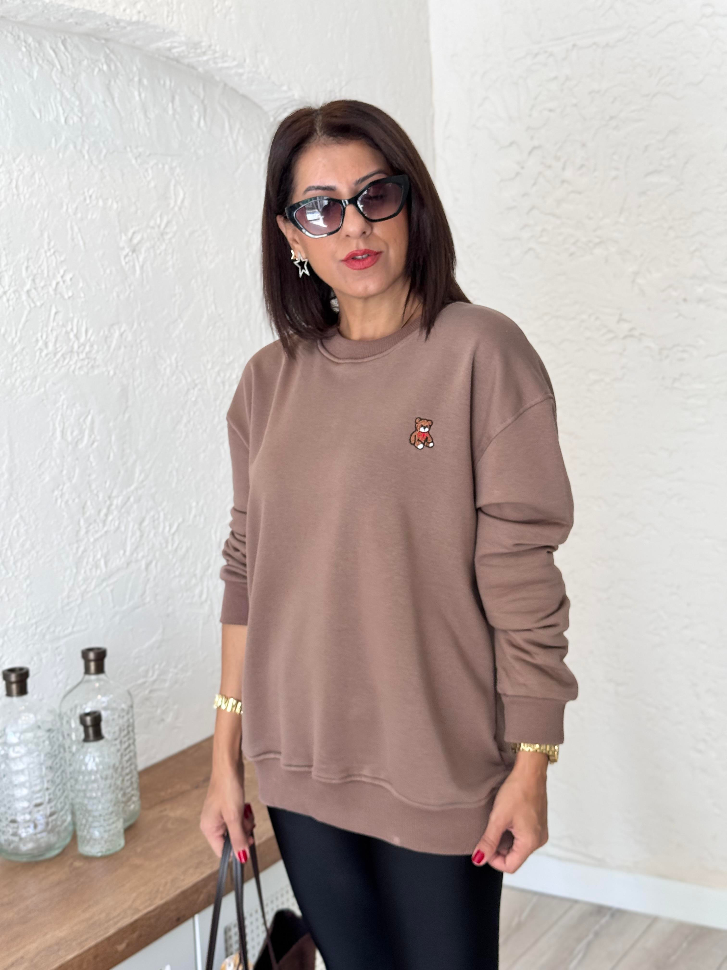 Bisiklet Yaka  Minik Ayıcık Baskı Detaylı swet  Kahverengi