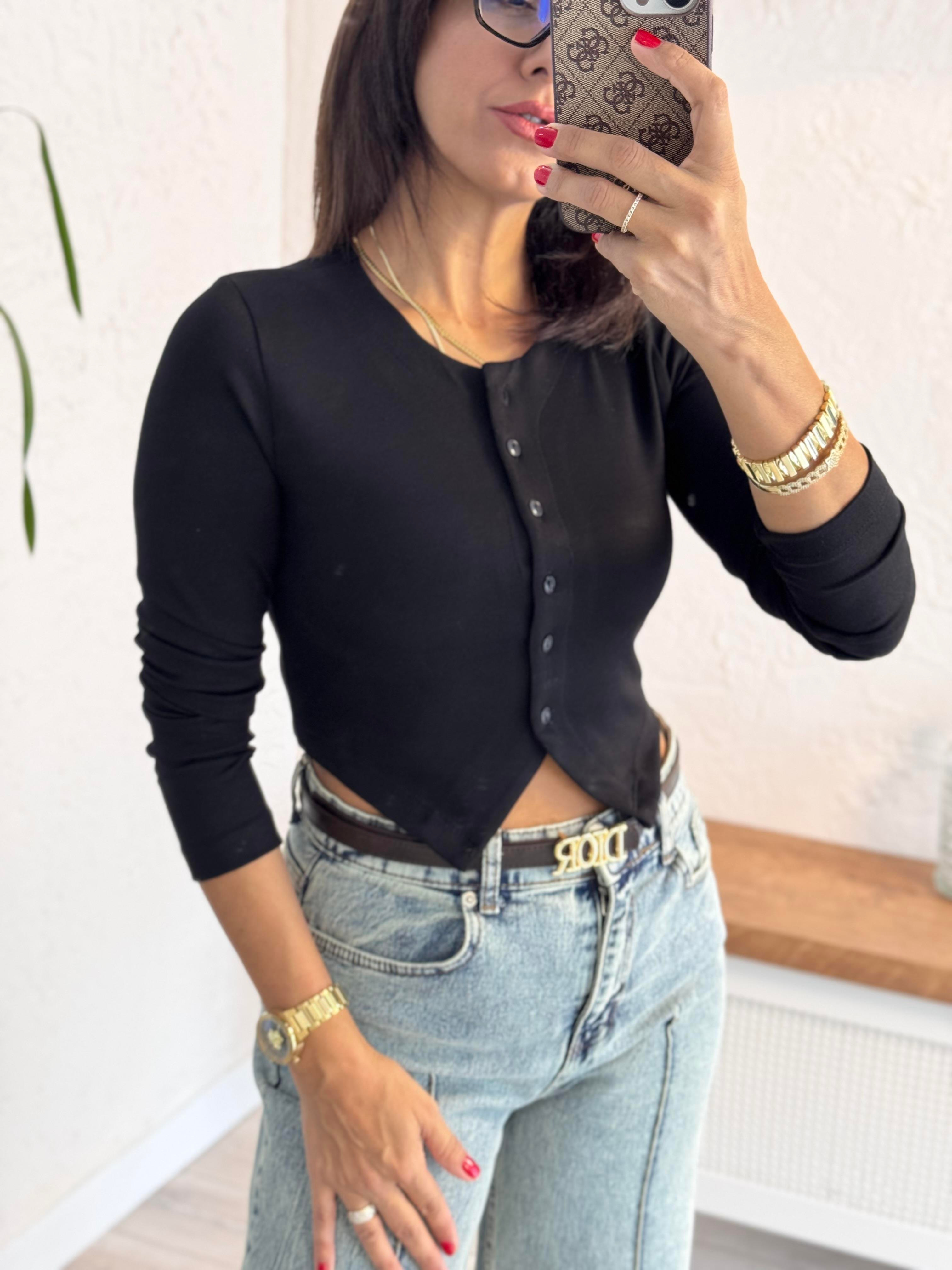 Boydan Düğmeli Uzun Kol Top Badi Siyah