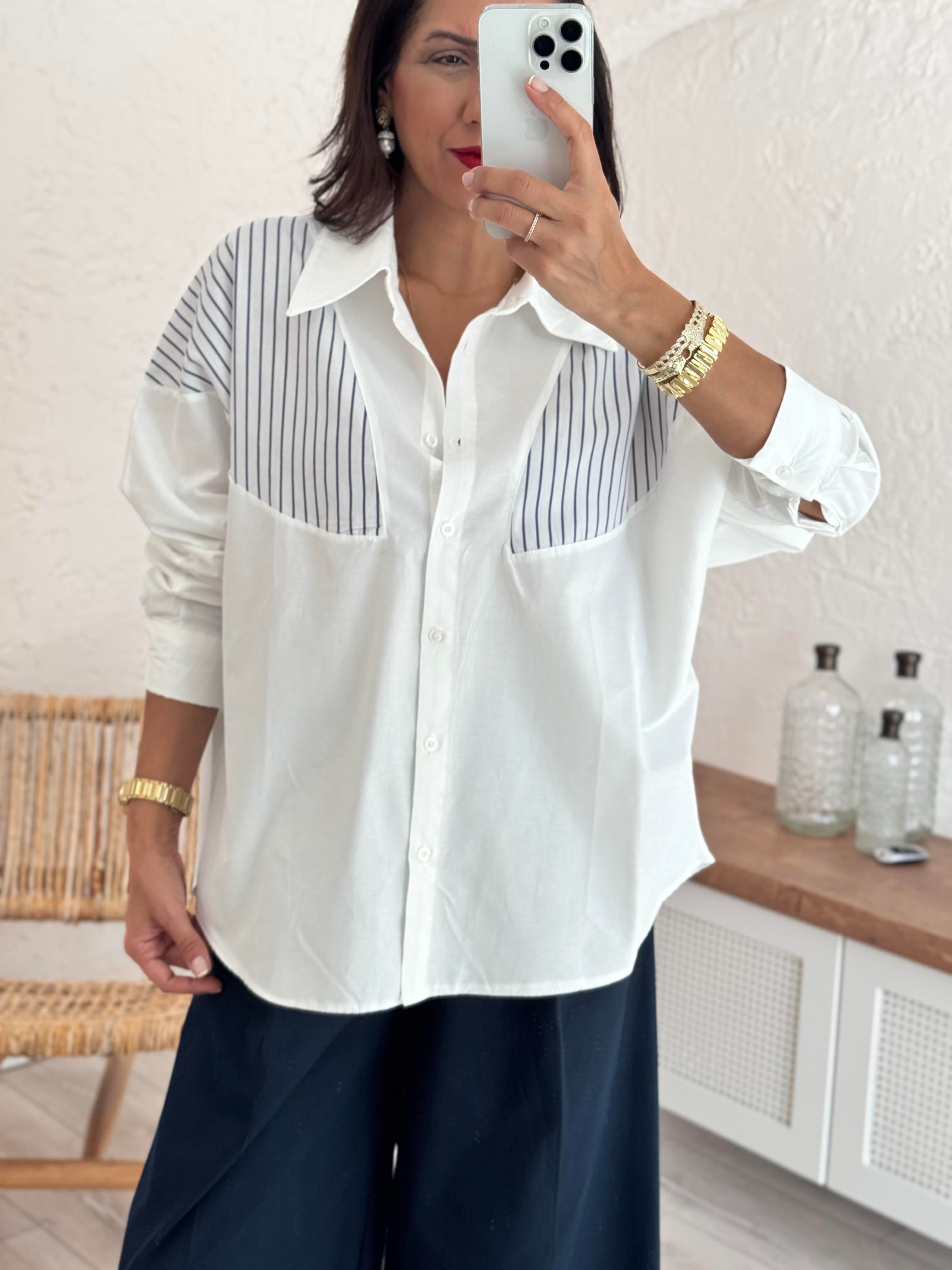 Ekru Lacivert Çizgili Gömlek (8395)