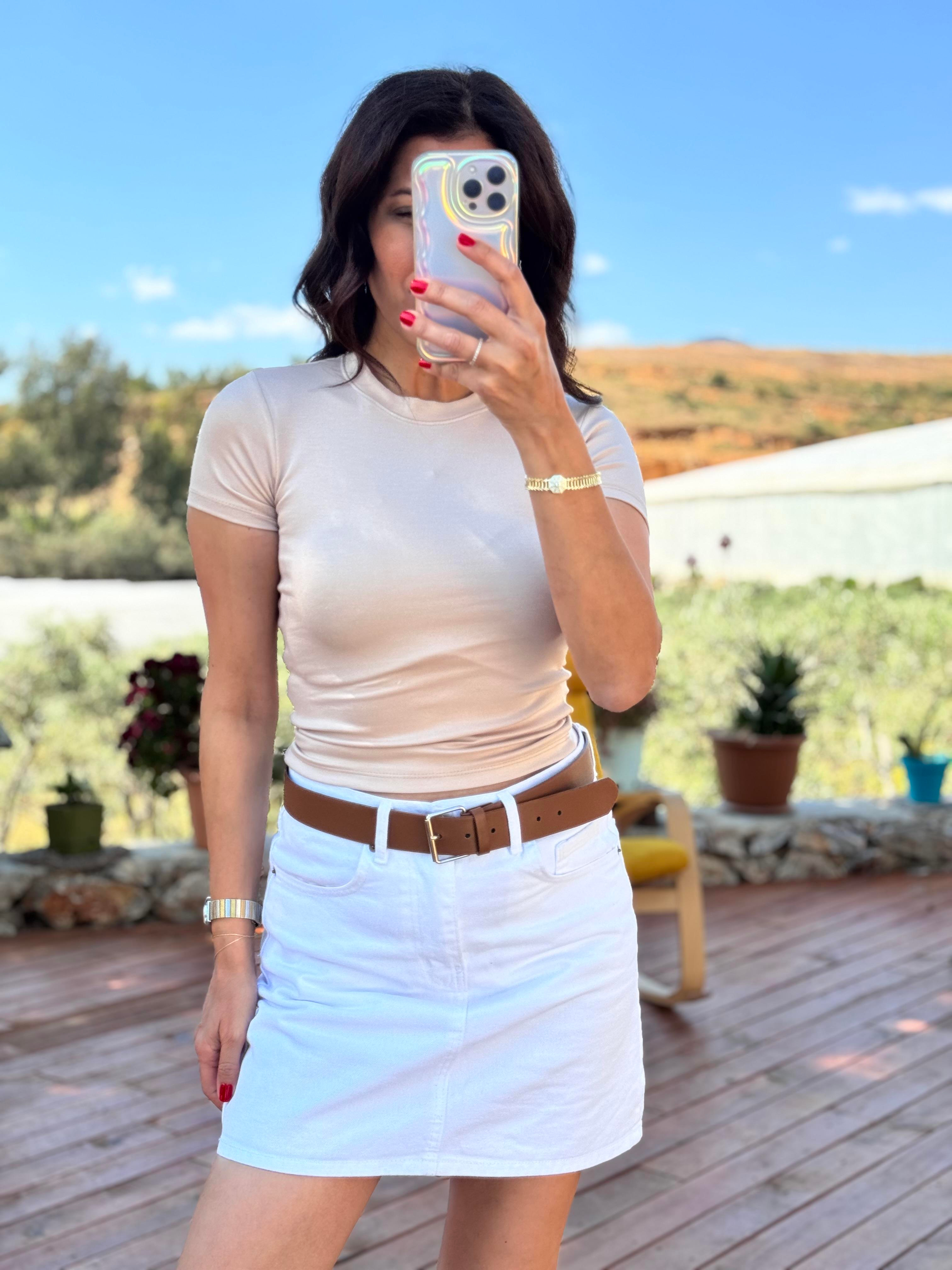 Kadın Bisiklet Yaka Modal Kumaş Yarım Kol Badi Krem
