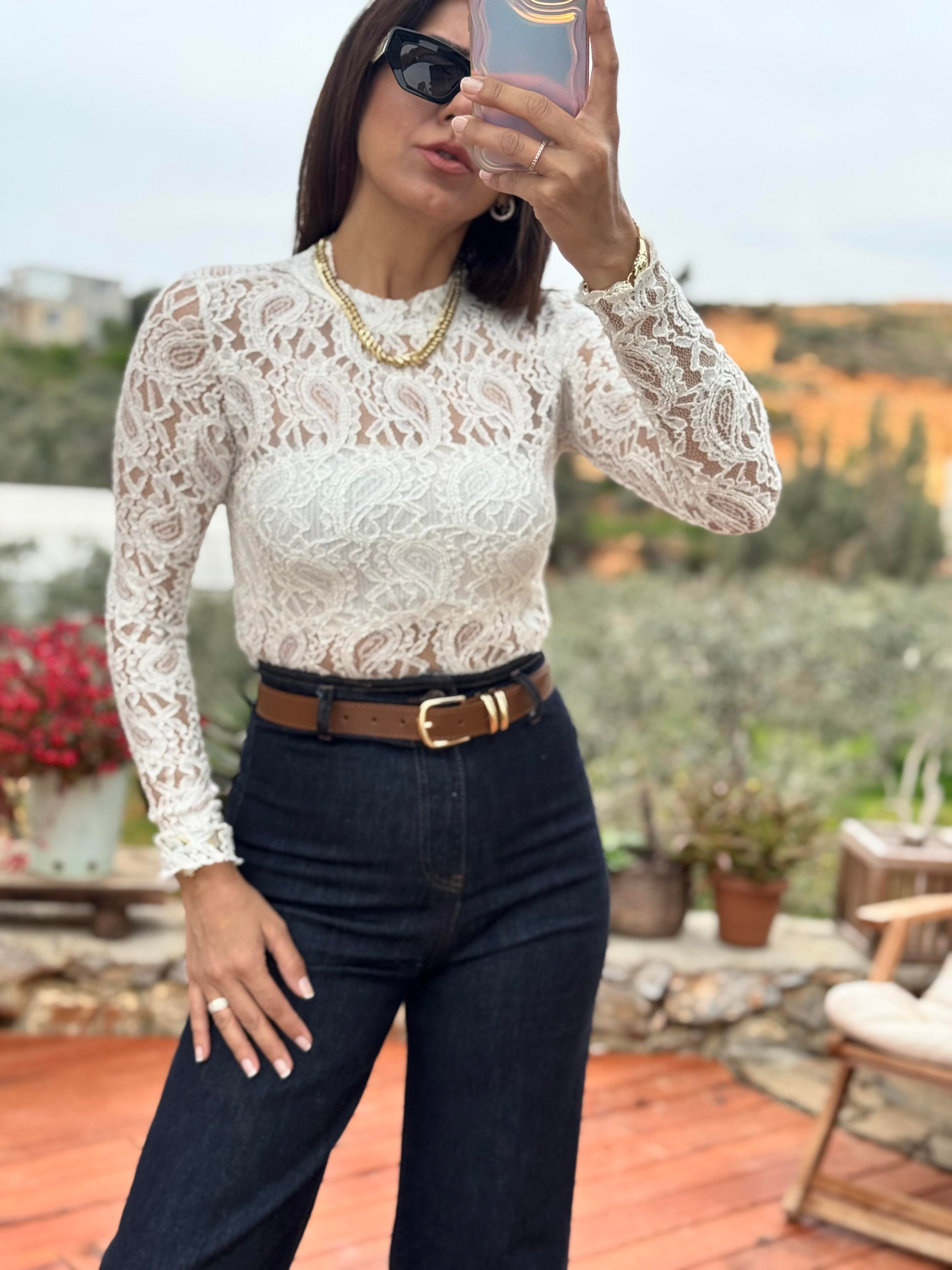 Kadın Dantel Detaylı Uzun Kollu Lüx Kalite Şık Badi Beyaz