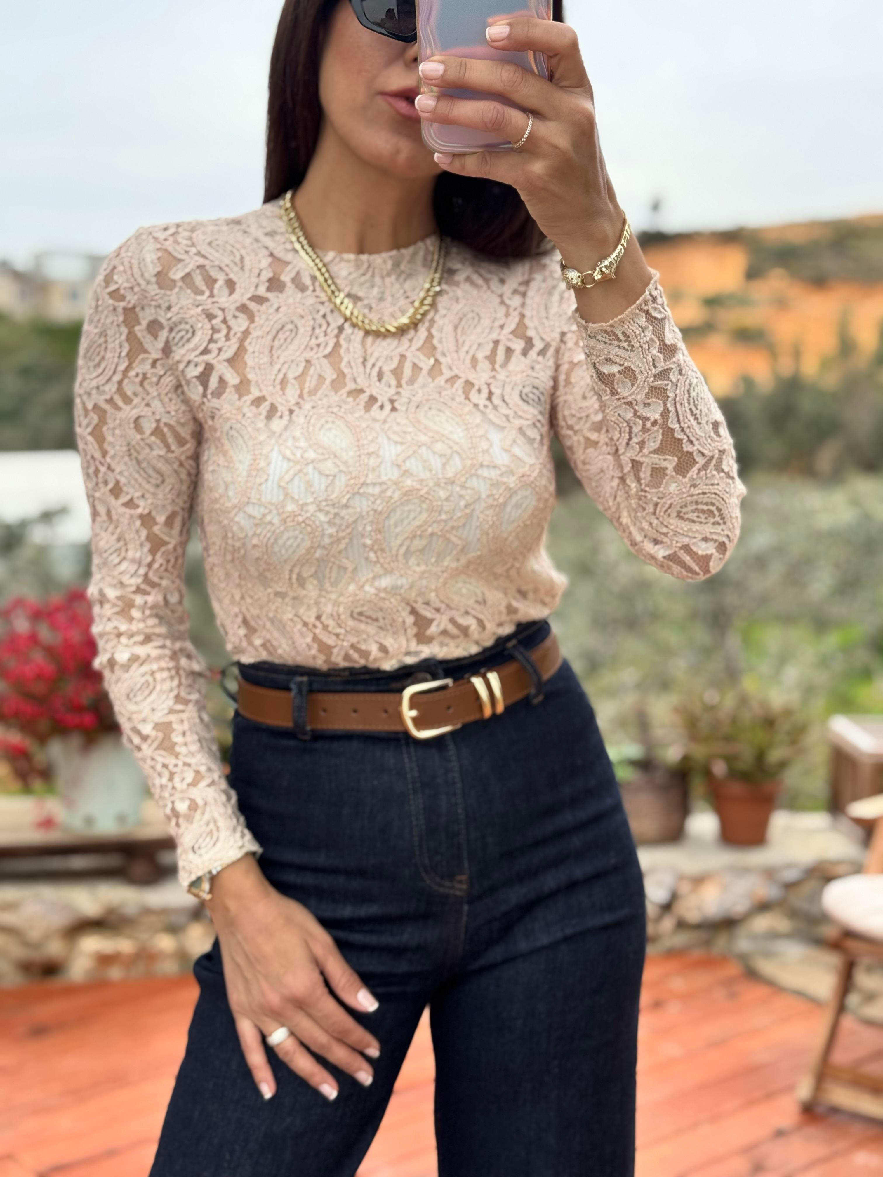 Kadın Dantel Detaylı Uzun Kollu Lüx Kalite Şık Badi Bej