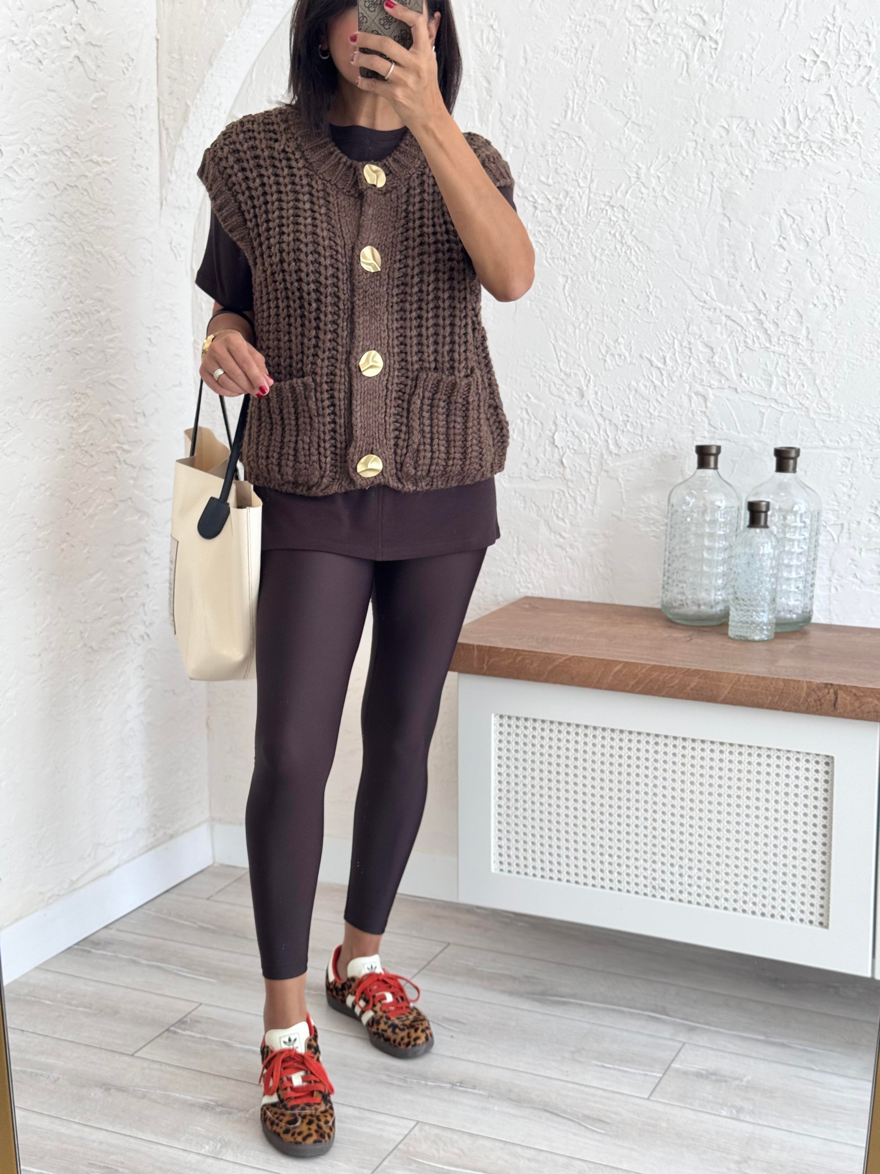 Kahve Bisiklet Yaka Yumuşak Dokulu Cepli Düğmeli Yelek