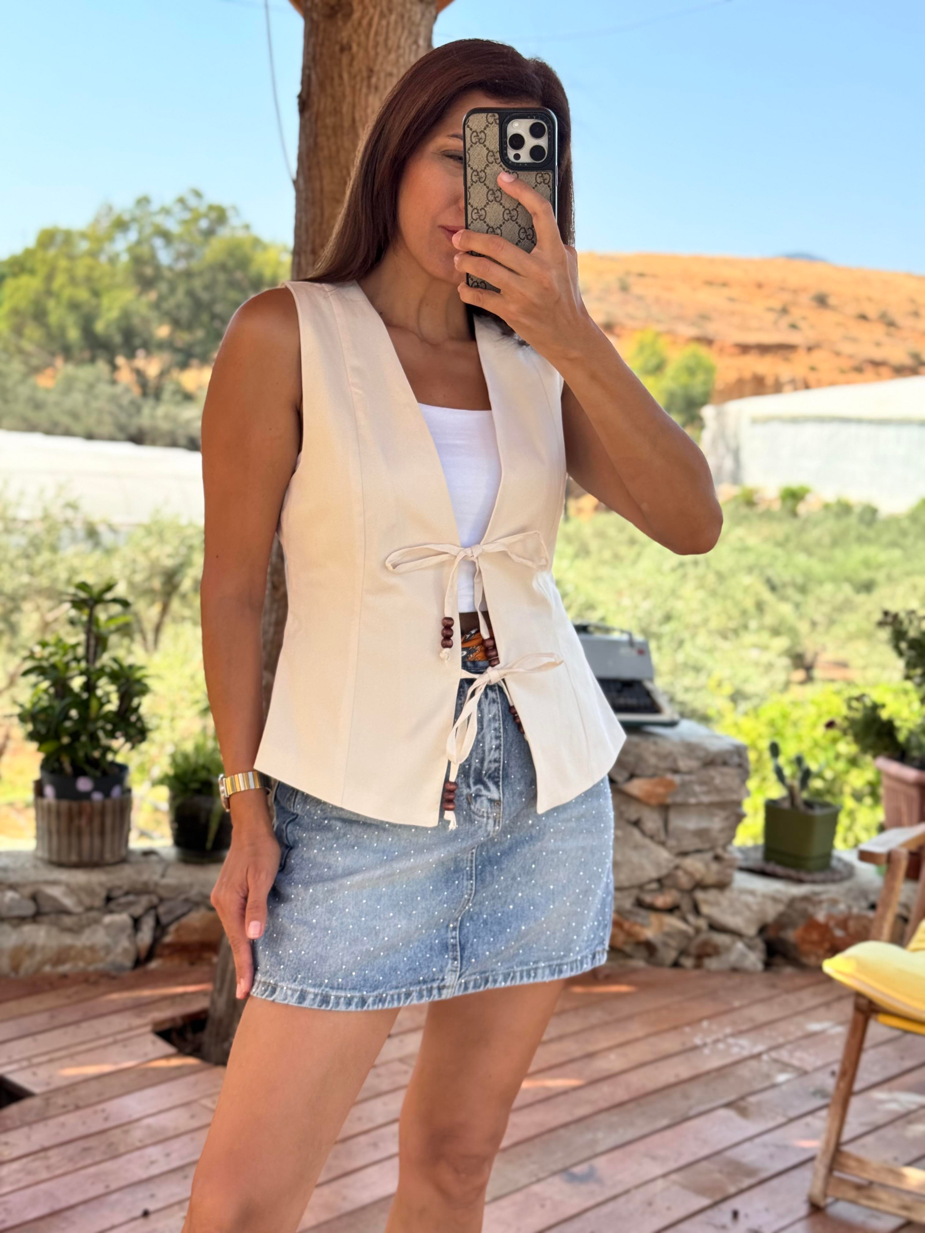 Mochka Likra Bağlama Boncuk Alsesuar Yelek Bej