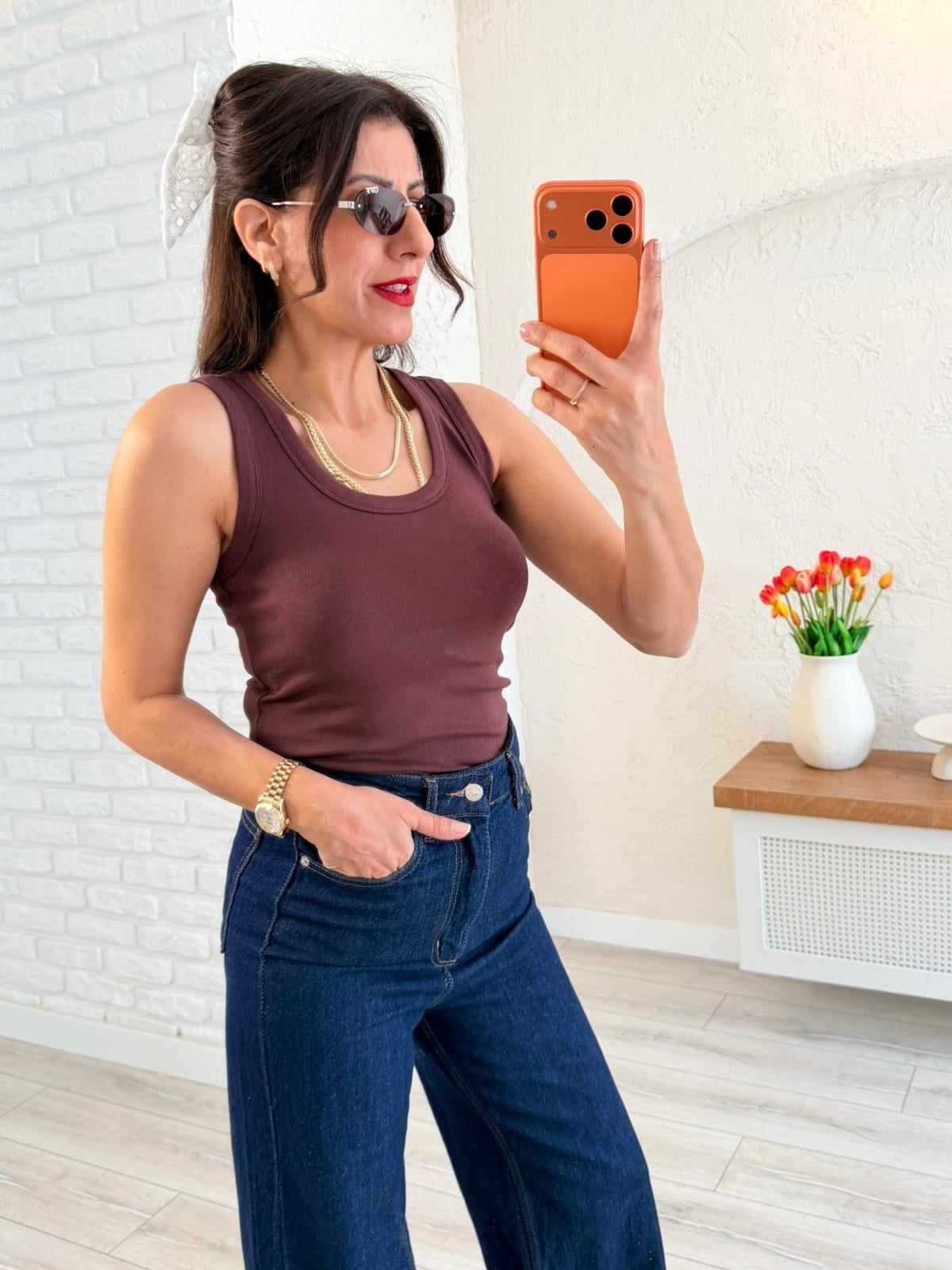 U Yaka Düz Basic Kalın Askılı Atlet  Kahve